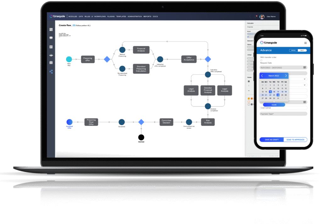 Timeqode is a low-code business process management platform aiming to develop web applications using modern interfaces. Due to the simple working mode, even users who do not have advanced knowledge of software development can create new applications or make changes to existing ones. Timeqode allows users to define their own interfaces, data models, business logic and process diagrams. With the help of plugins, integration can be created between the developed applications and an ERP or CRM solution, or any system that provides an Application Programming Interface (API).