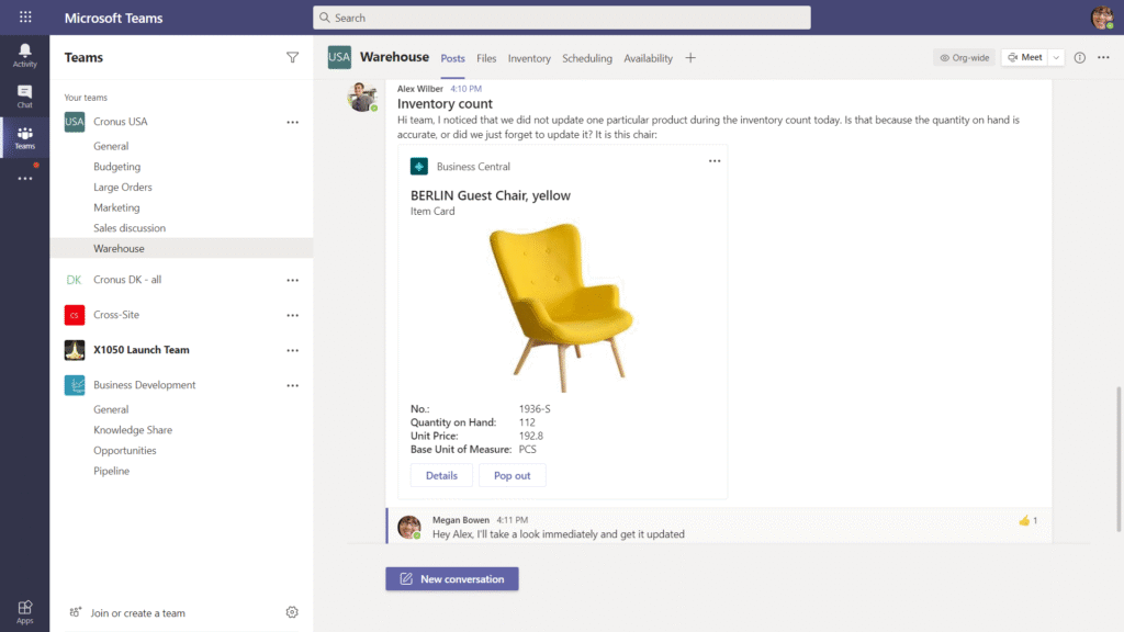 With Microsoft Teams you can share information directly from within Dynamics 365 Business Central.