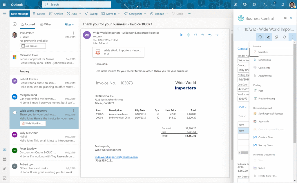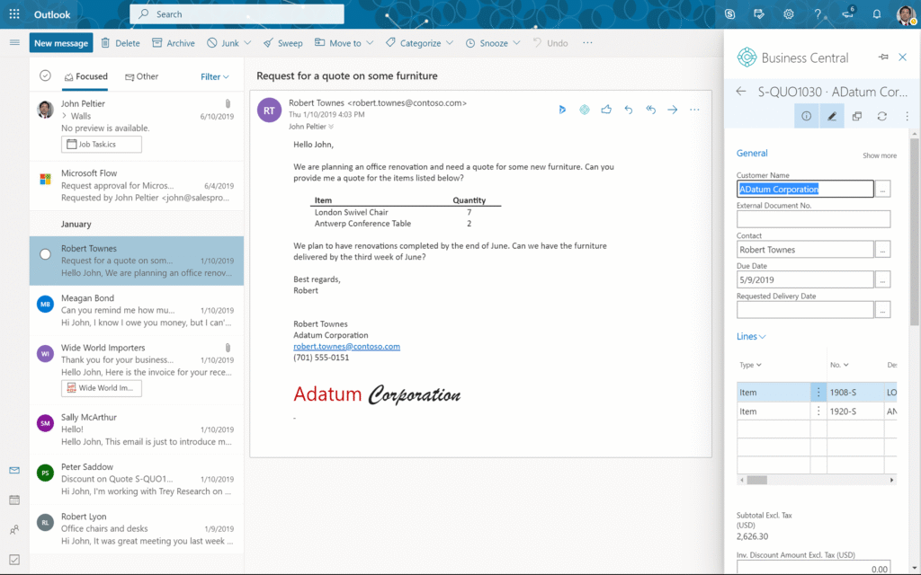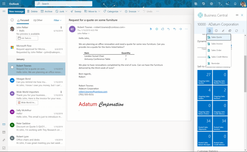 Dynamics 365 Business Central enables you to take immediate action directly from email communications, eliminating potential inaccuracies when entering data such as customer quotes, orders, or invoices.