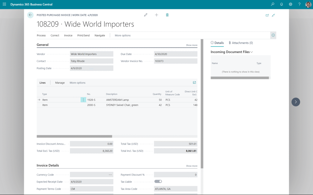 Dynamics 365 Business Central can be embedded in Outlook to simplify purchase invoice entry within an application you already use.